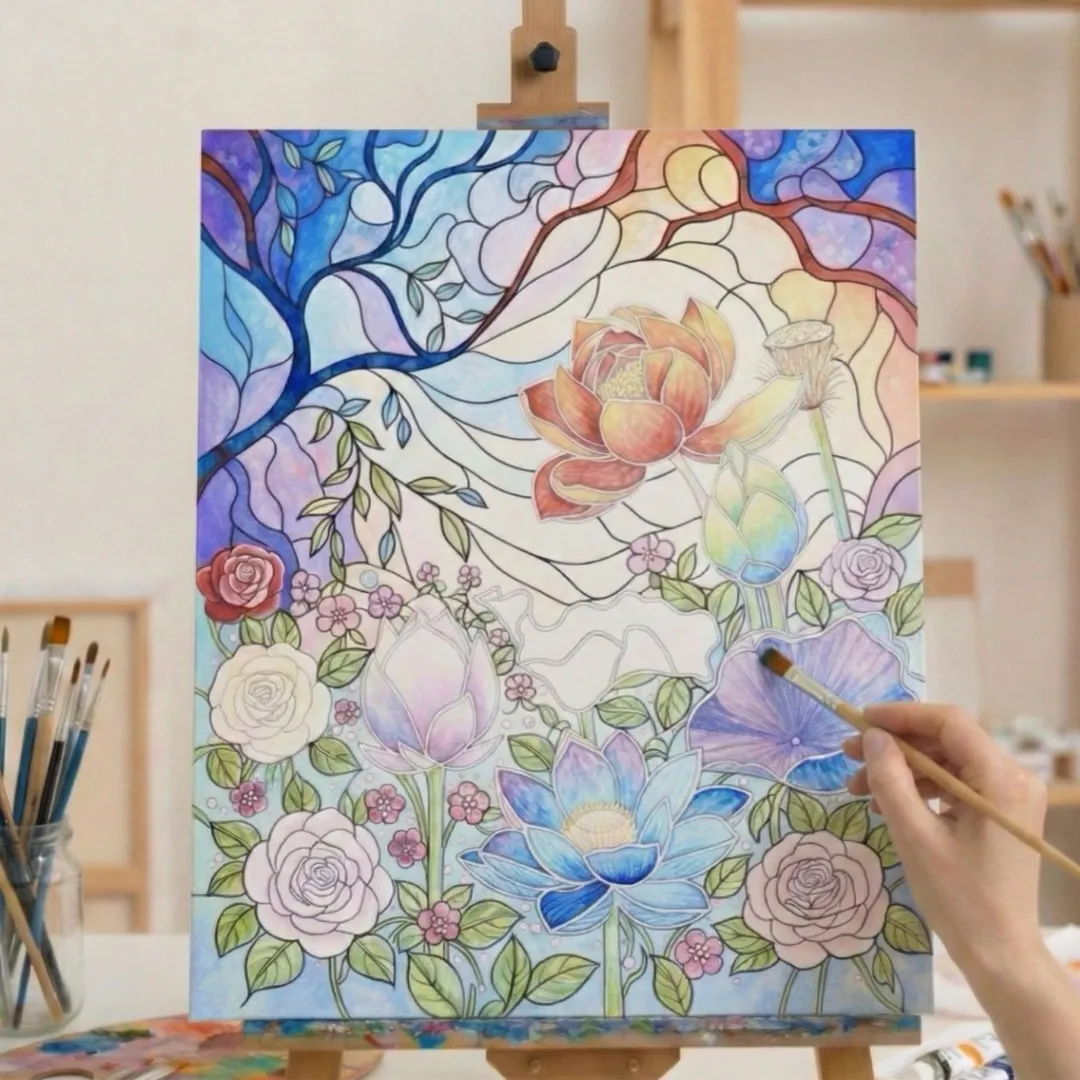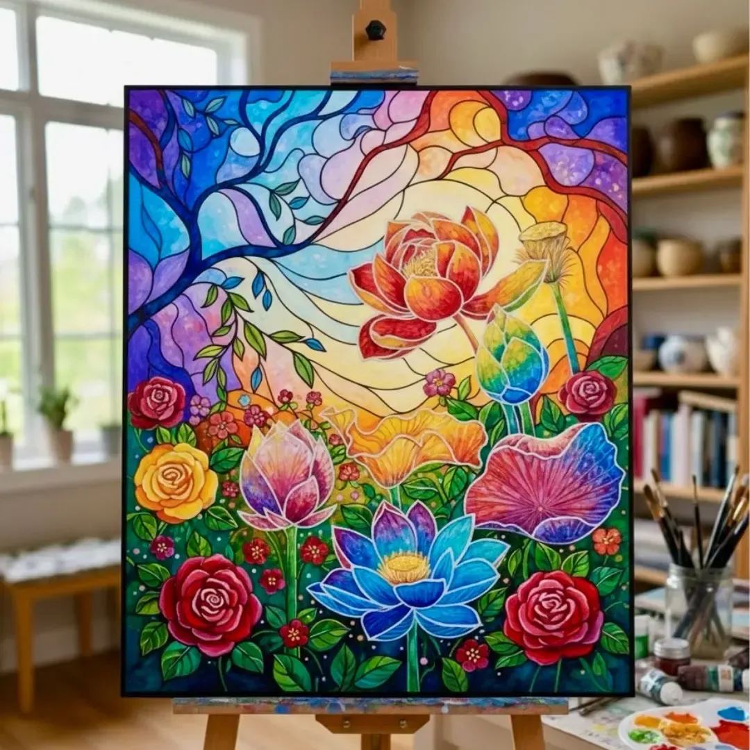 You’ll learn everything from setting up your canvas to outlining and painting your stained-glass-style flower garden. By the end, you’ll have a bright, colorful piece you’ll be proud to hang on your wall.